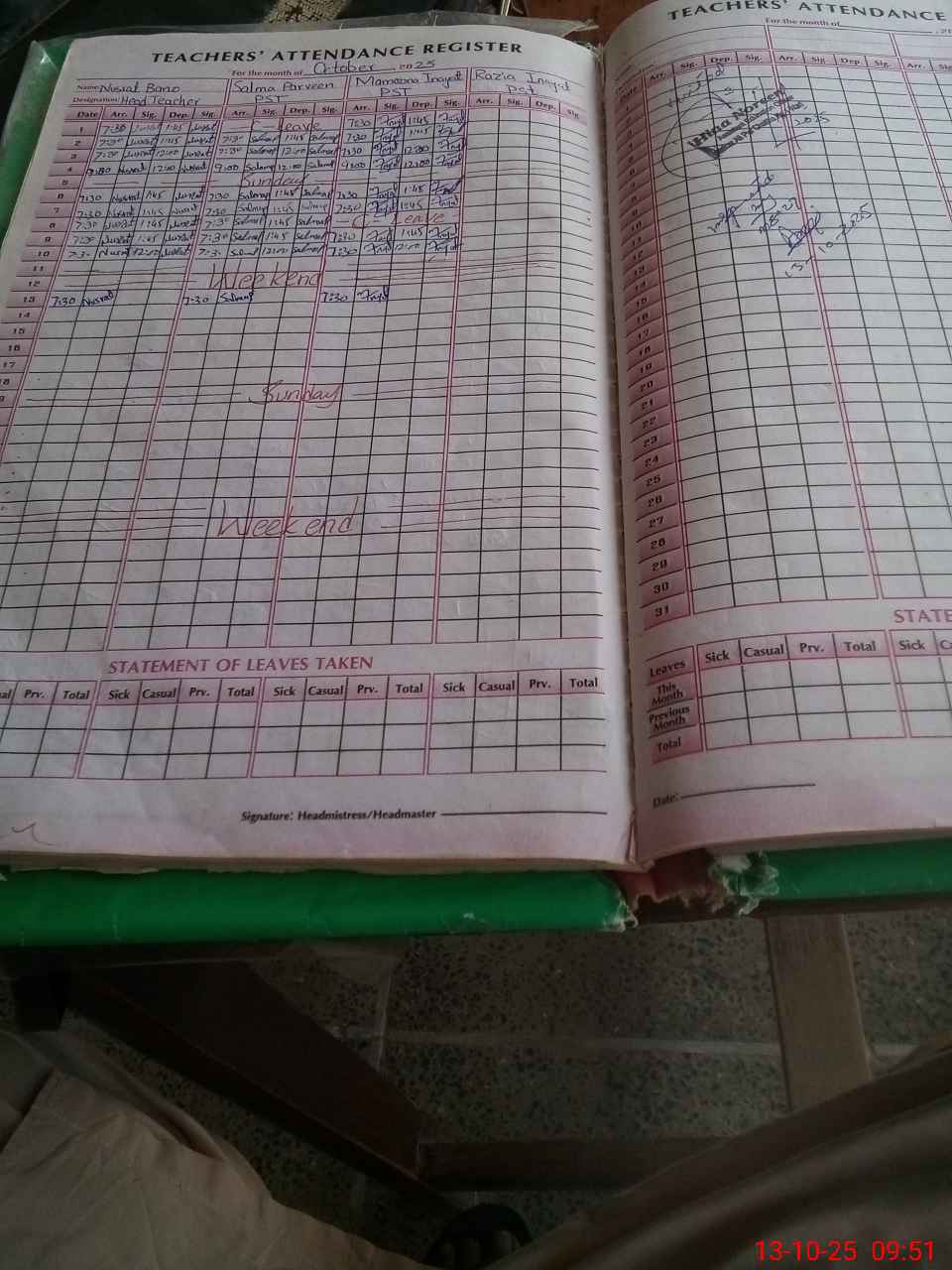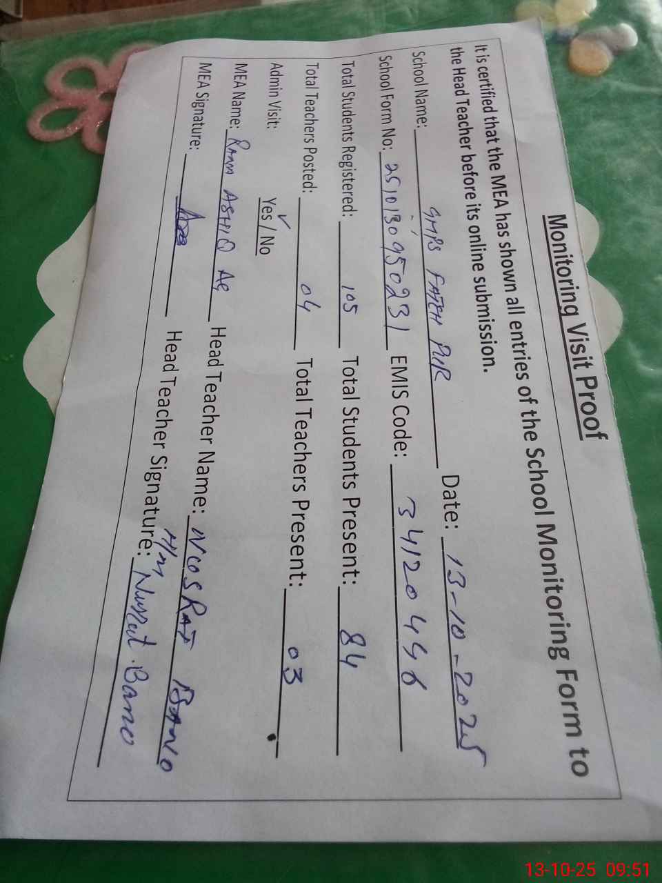 | Attendance Register | Head Teacher | MEA with School | Visit Proof |