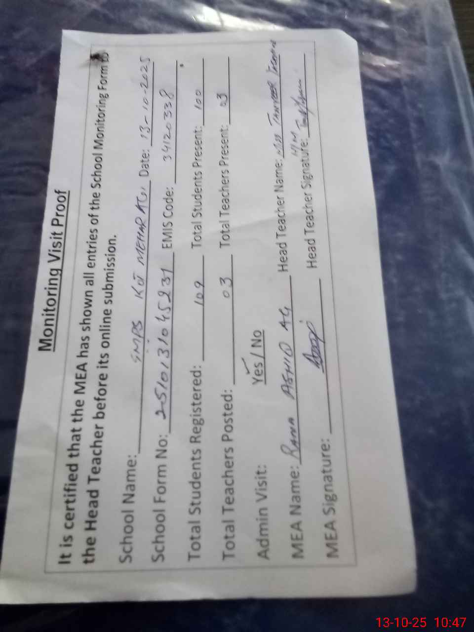 | Attendance Register | Head Teacher | MEA with School | Visit Proof |
