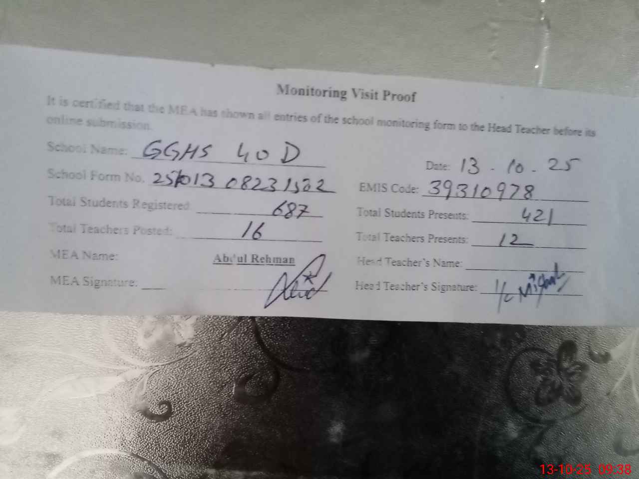 | Attendance Register | Head Teacher | MEA with School | Visit Proof |