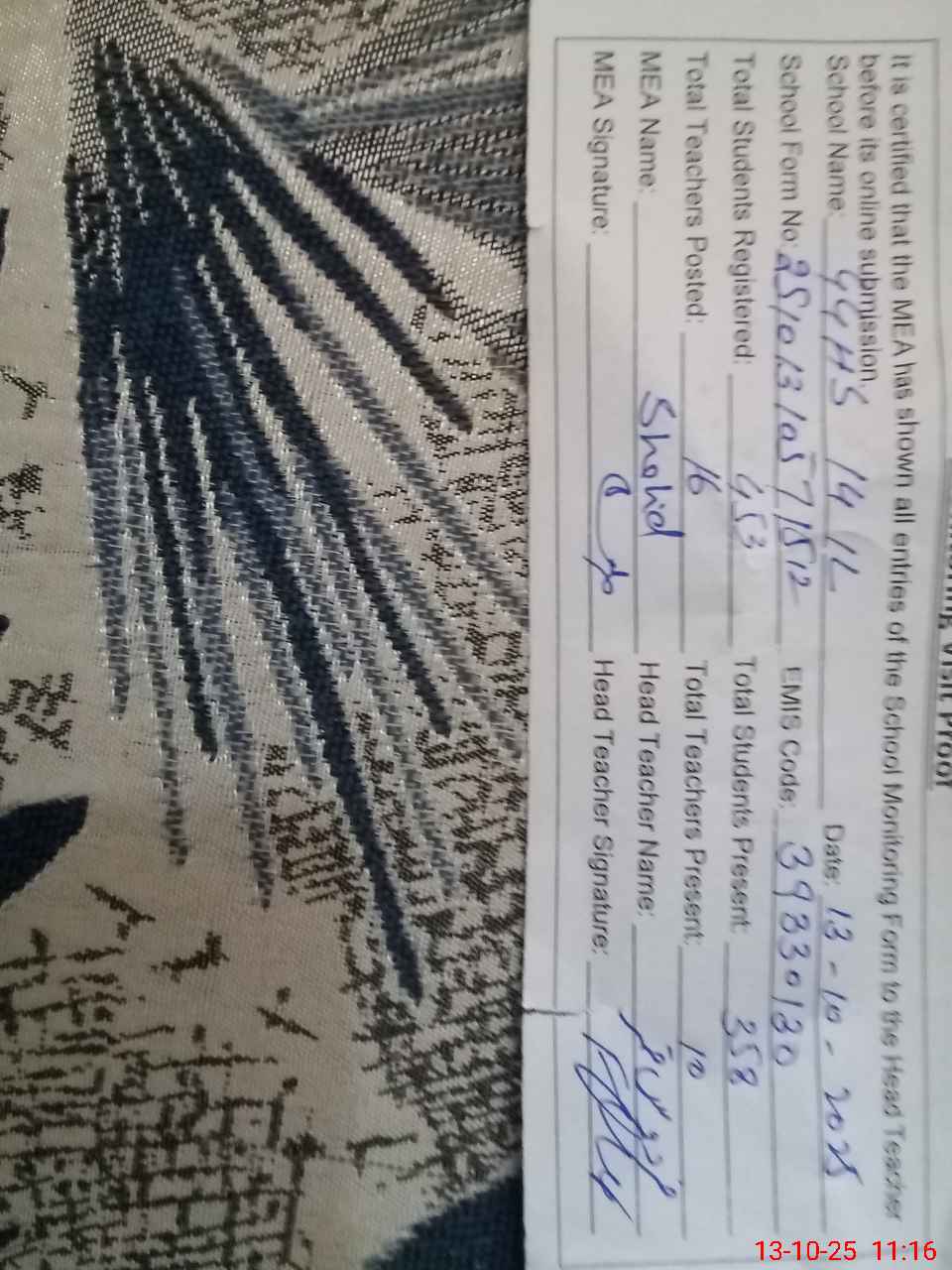 | Name: NA**** AK**** Designation: (School Headmaster's/Headmistress's) SHM Phone/Cell Number: 03**** |