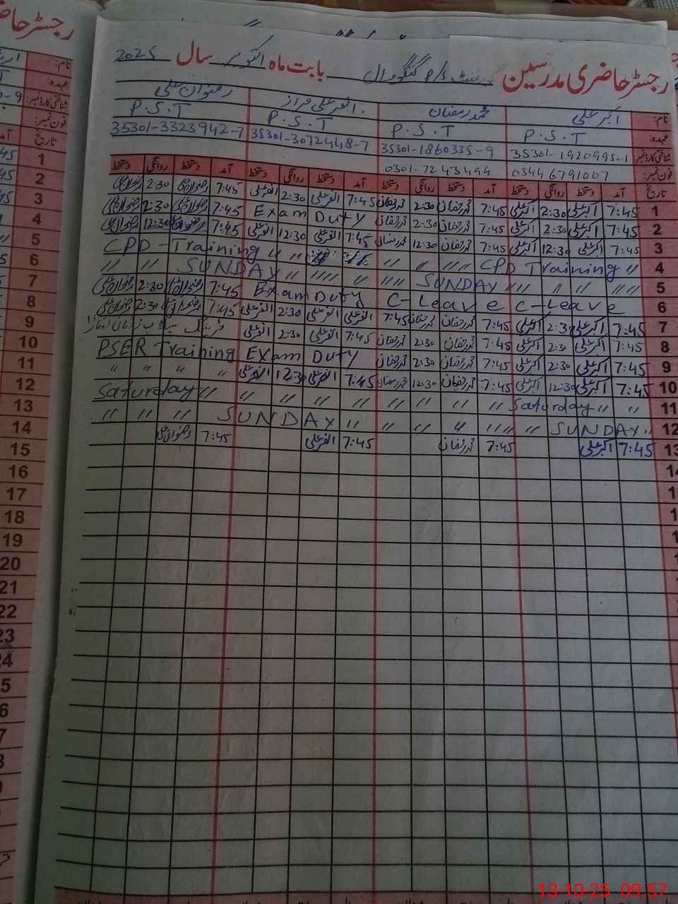 | CNIC | Full Name | Designation | R/C | Absence During Last Calender Month |