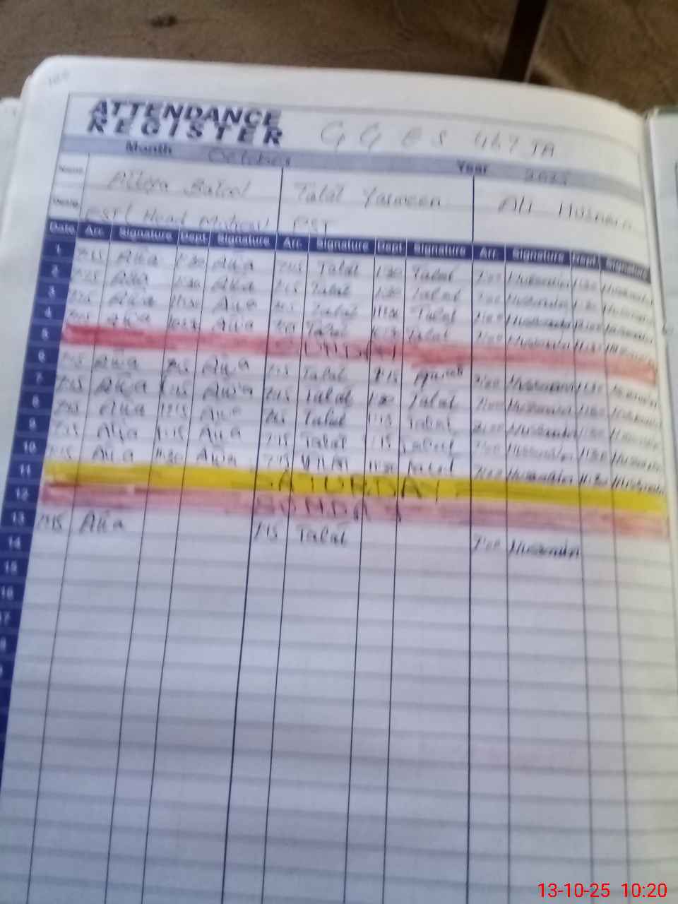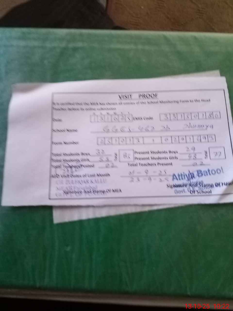 | Remarks (Use Separate Page if Required): Ali Hassan chkidar was found abent at the time of visit attandance marked but not available | |||||
