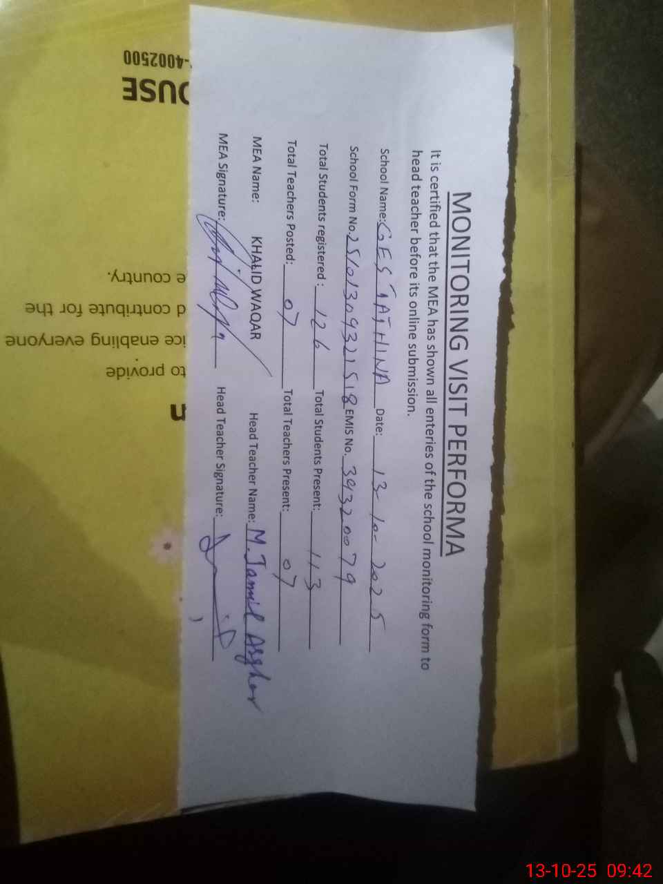 | Attendance Register | Head Teacher | MEA with School | Visit Proof |