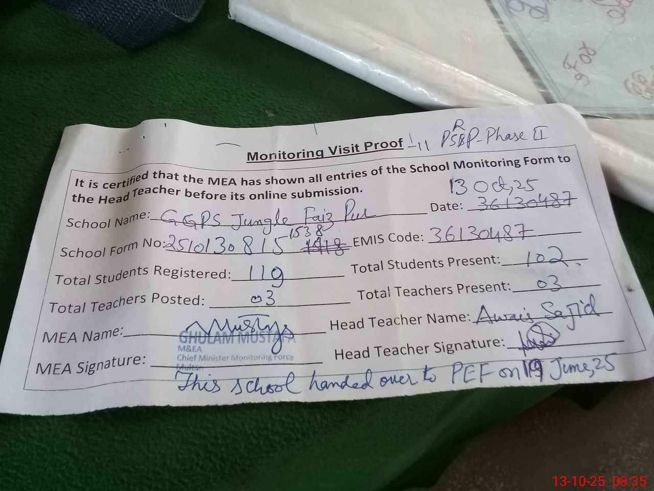 | Remarks (Use Separate Page if Required): This school handed over to PEF on 19 June 2025 | |||||