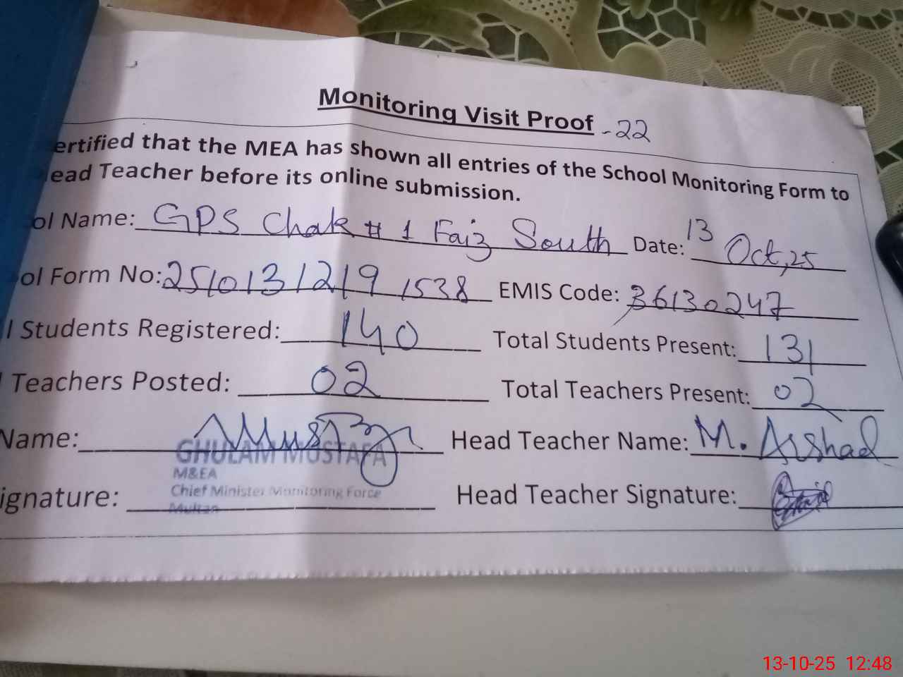 | Monitoring Date: 13-10-2025 | Start Time: 13-10-2025 12:19 PM | End Time: 13-10-2025 01:01 PM | Name of MEA: Gh**** Mu**** | |