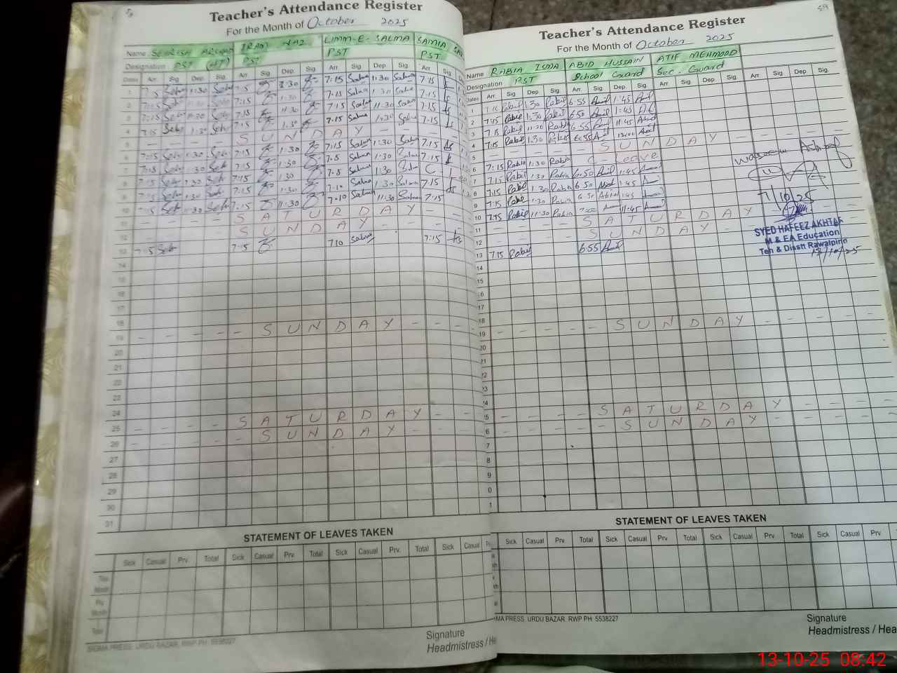 | Monitoring Date: 13-10-2025 | Start Time: 13-10-2025 08:26 AM | End Time: 13-10-2025 09:03 AM | Name of MEA: Sy**** Ha**** Ak**** | |