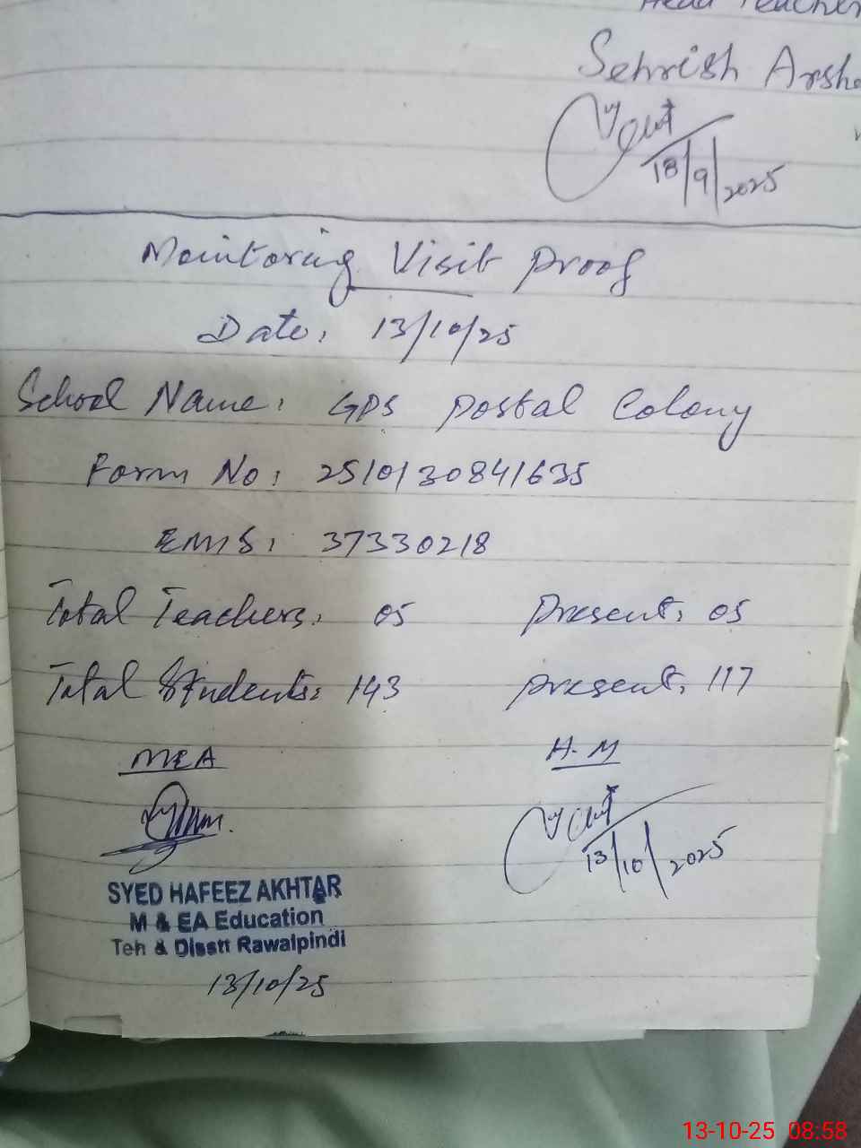 | EMIS Code: 37330218 | Name of School: GPS POSTAL COLONY | |||