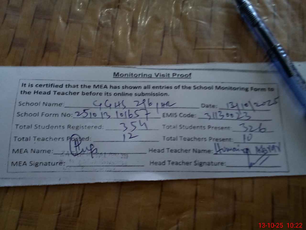 | Attendance Register | Head Teacher | MEA with School | Visit Proof |