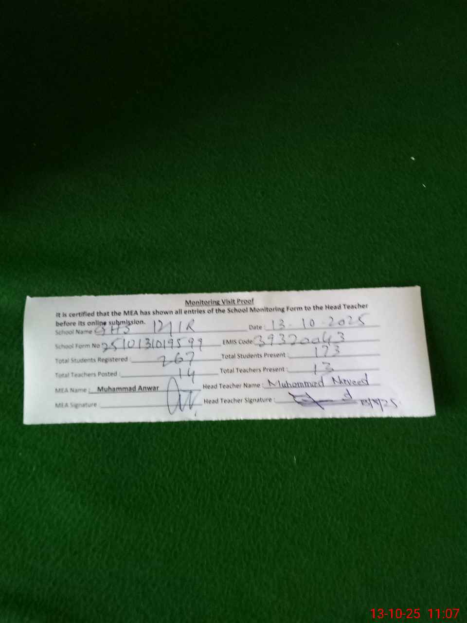 | Certified that this School was Inspected by the Undersigned MEA/DMO Today and the Information Stated Above is as Per Record. | |||||