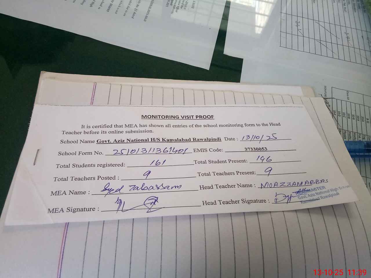| Attendance Register | Head Teacher | MEA with School | Visit Proof |