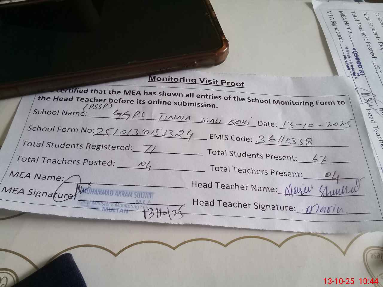 | Attendance Register | Head Teacher | MEA with School | Visit Proof |