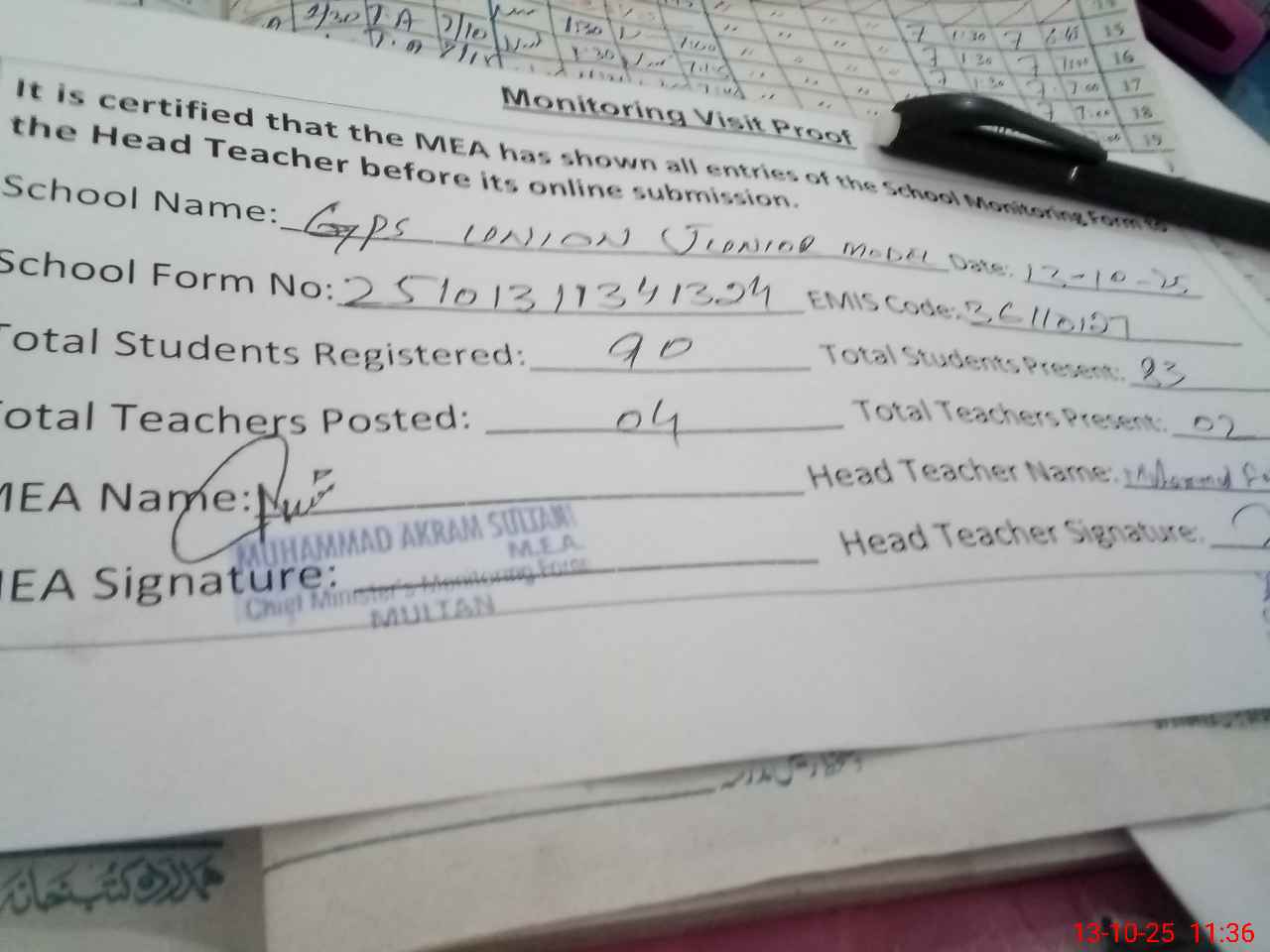 | Attendance Register | Head Teacher | MEA with School | Visit Proof |