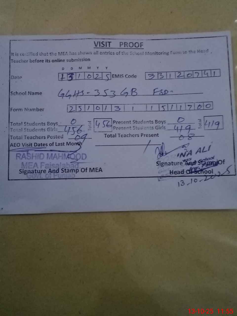 | Certified that this School was Inspected by the Undersigned MEA/DMO Today and the Information Stated Above is as Per Record. | |||||