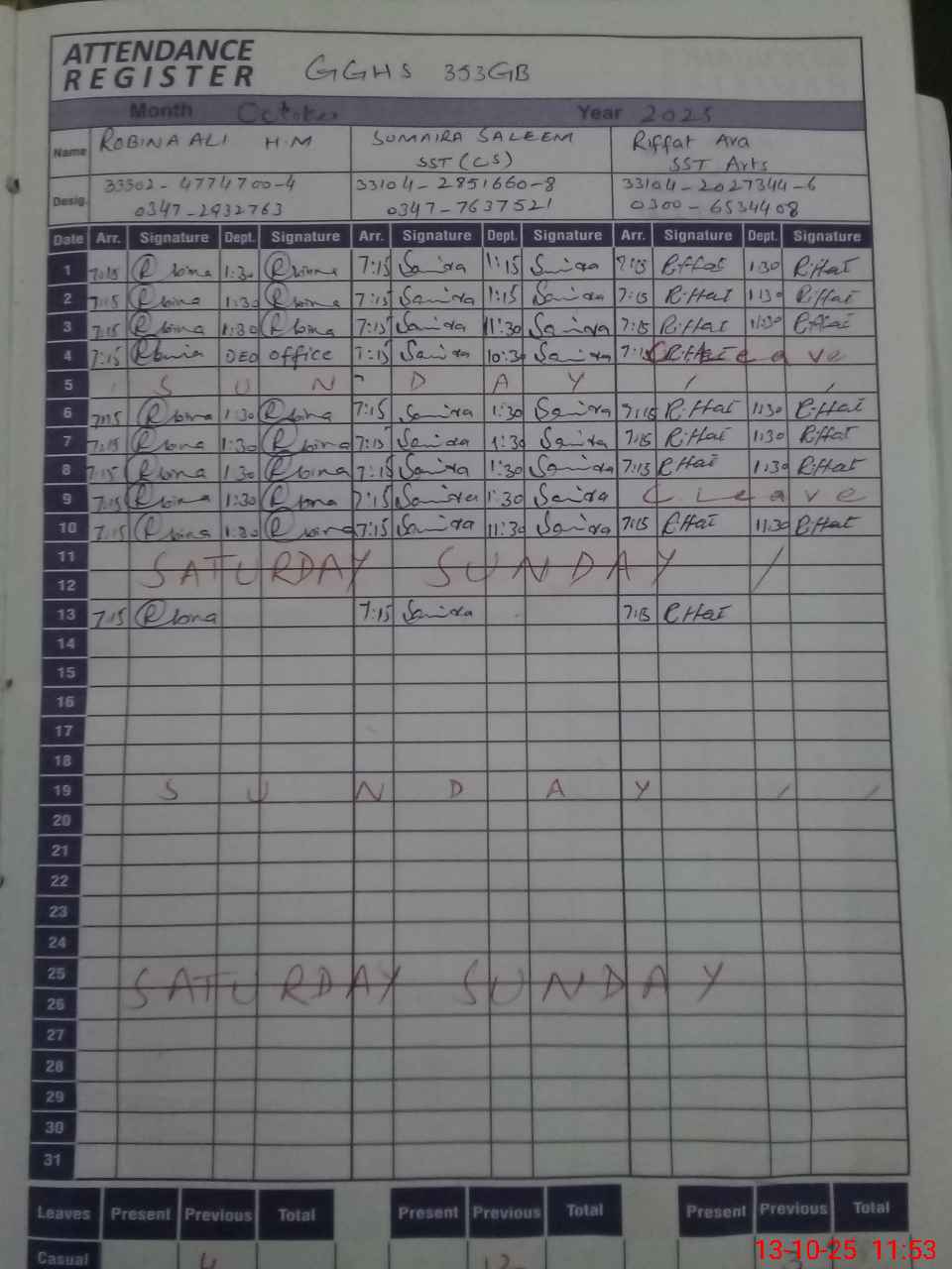 | CNIC | Full Name | Designation | R/C | Absence During Last Calender Month |