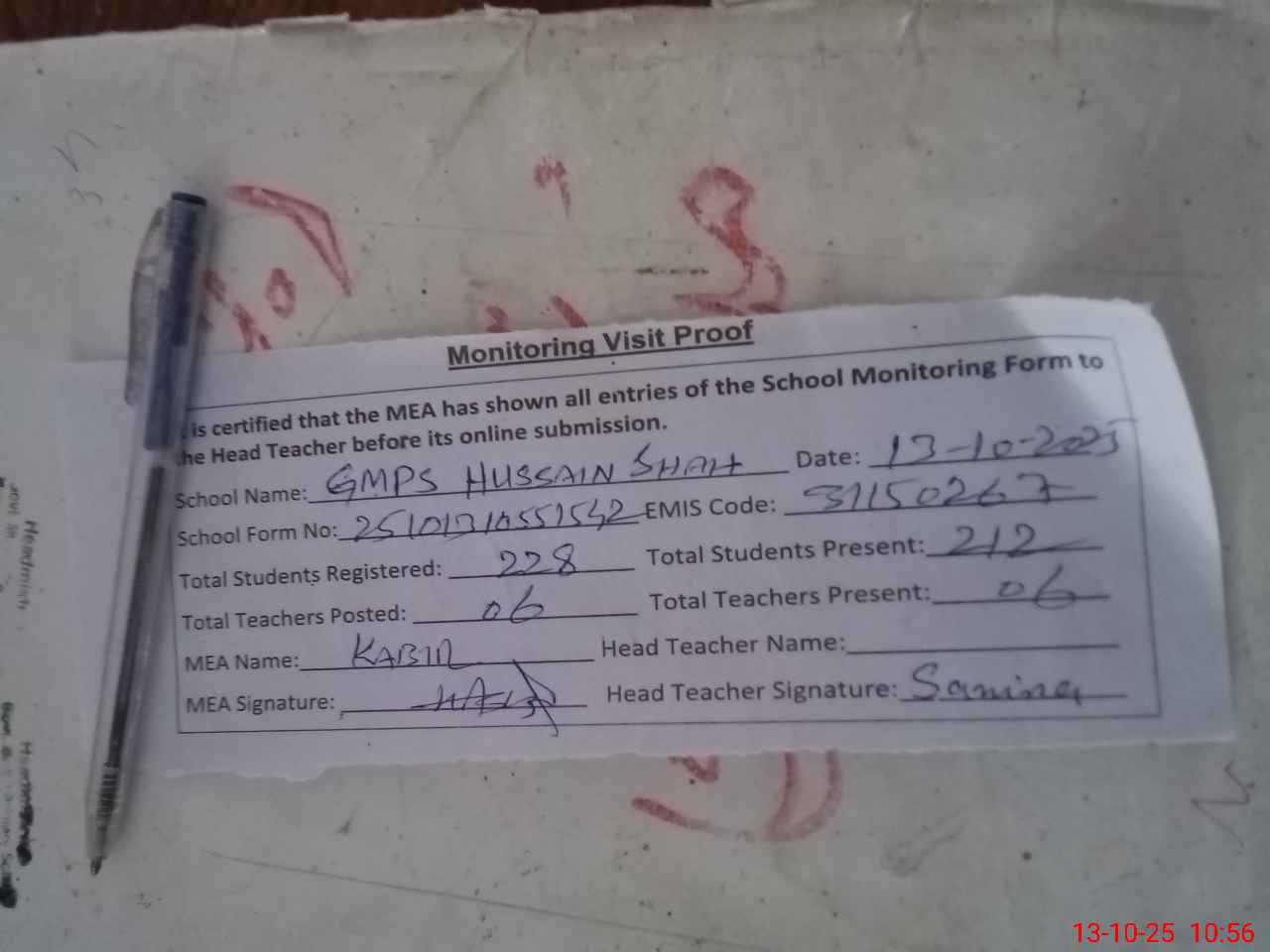 | Attendance Register | Head Teacher | MEA with School | Visit Proof |