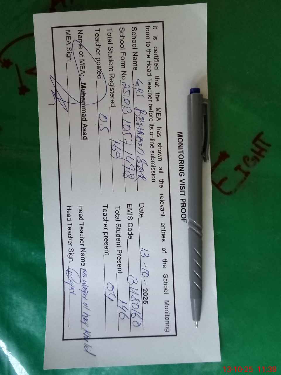 | Attendance Register | Head Teacher | MEA with School | Visit Proof |