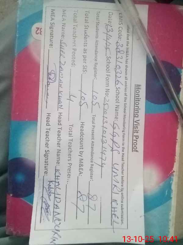 | Attendance Register | Head Teacher | MEA with School | Visit Proof |