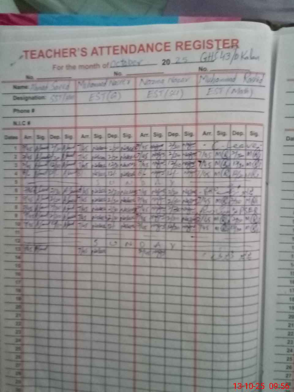 | CNIC | Full Name | Designation | R/C | Absence During Last Calender Month |