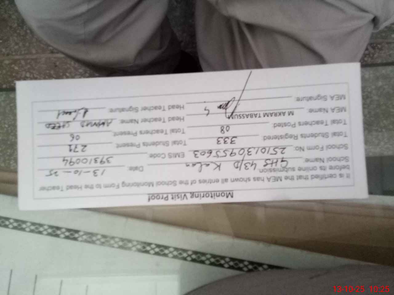 | Certified that this School was Inspected by the Undersigned MEA/DMO Today and the Information Stated Above is as Per Record. | |||||