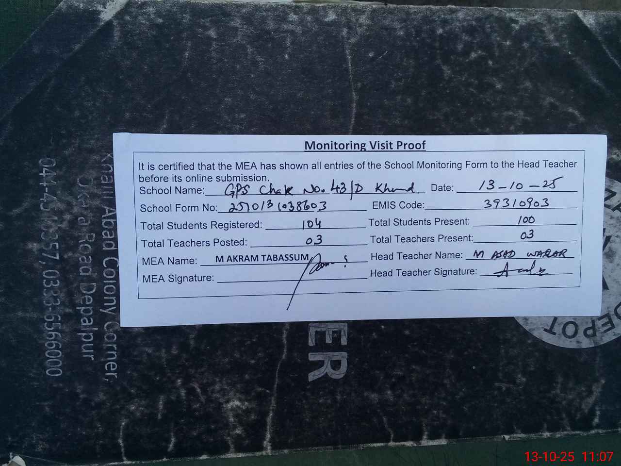 | Name: MU**** AS**** WA**** Designation: (School Headmaster's/Headmistress's) PST Phone/Cell Number: 03**** |