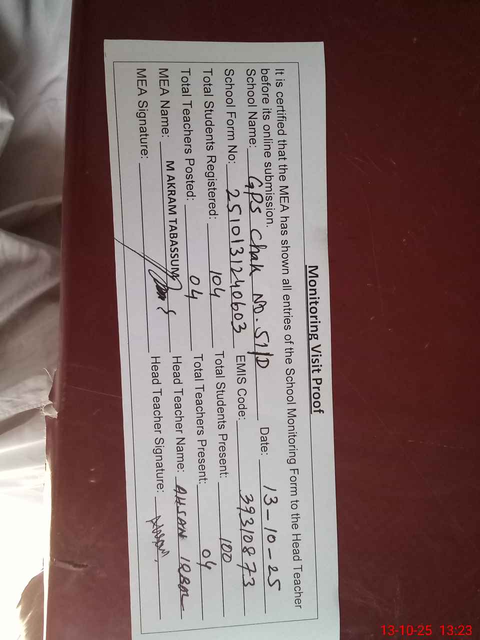 | EMIS Code: 39310873 | Name of School: GPS CHAK NO. 51-D | |||