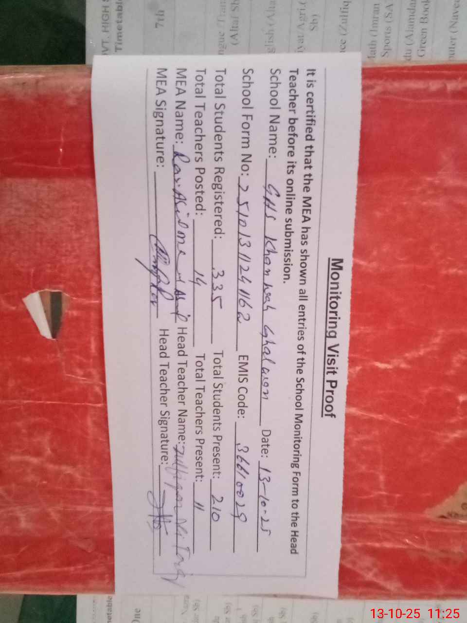 | Attendance Register | Head Teacher | MEA with School | Visit Proof |