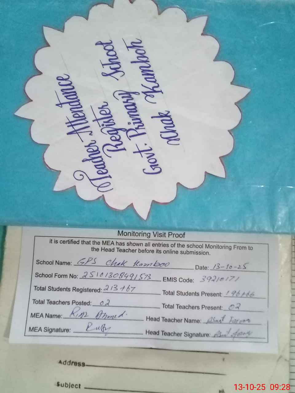 | Attendance Register | Head Teacher | MEA with School | Visit Proof |