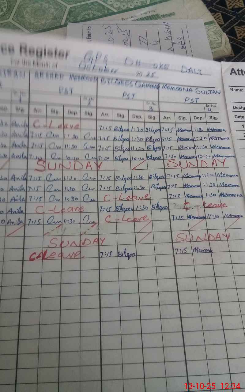 | CNIC | Full Name | Designation | R/C | Absence During Last Calender Month |