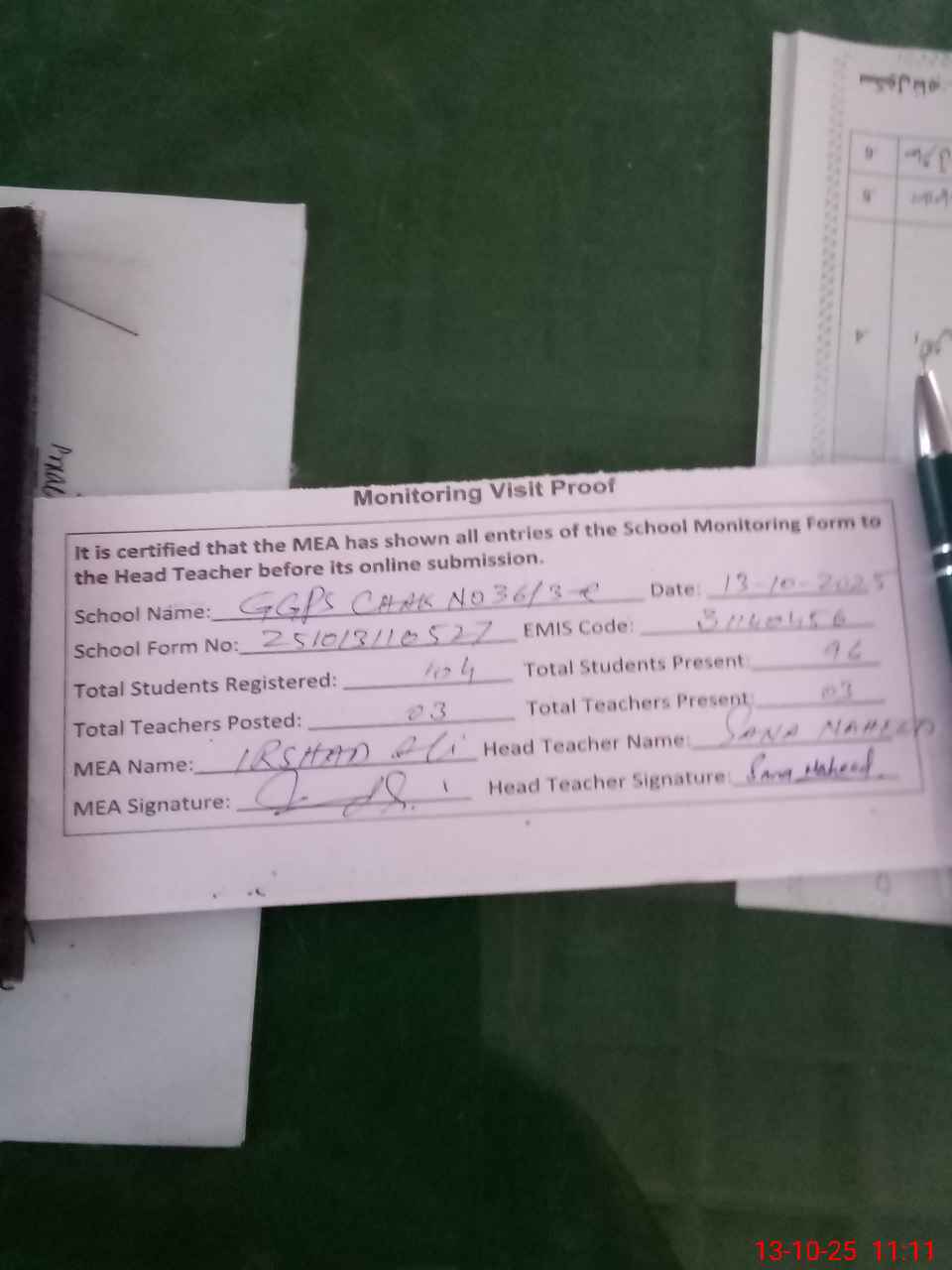 | Attendance Register | Head Teacher | MEA with School | Visit Proof |