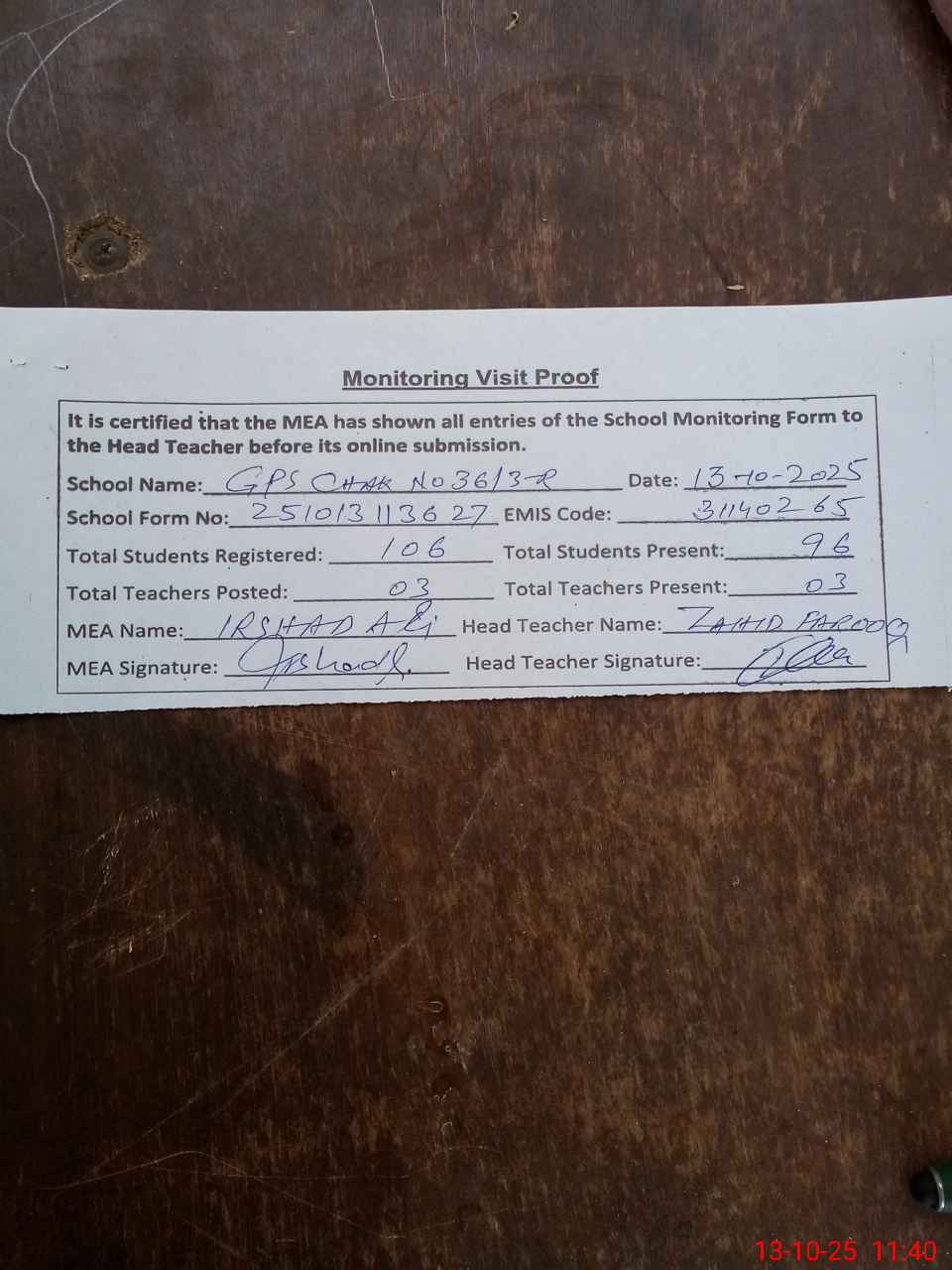 | Attendance Register | Head Teacher | MEA with School | Visit Proof |