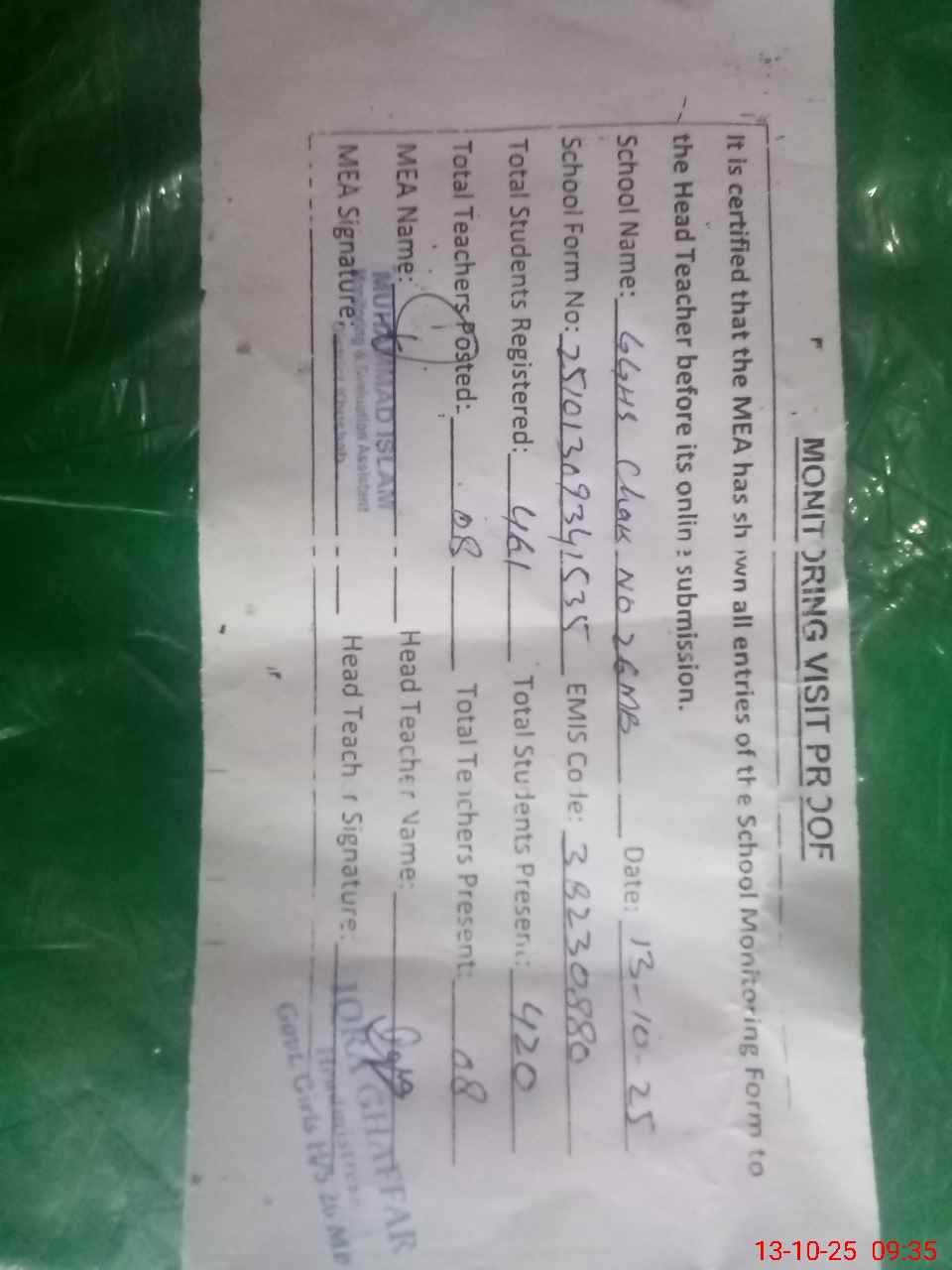 | EMIS Code: 38230880 | Name of School: GGHS CHAK NO 26 MB | |||