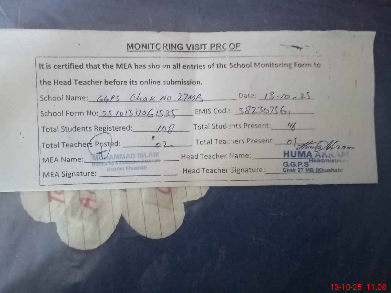 | Attendance Register | Head Teacher | MEA with School | Visit Proof |