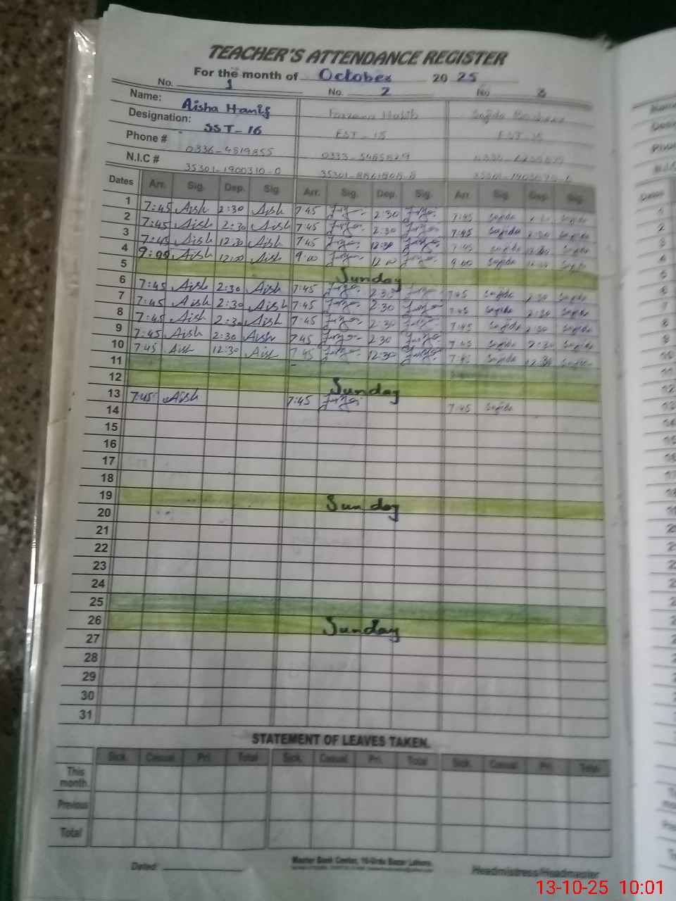 | Name: AI**** HA**** Designation: (School Headmaster's/Headmistress's) SST GENERAL Phone/Cell Number: 03**** |