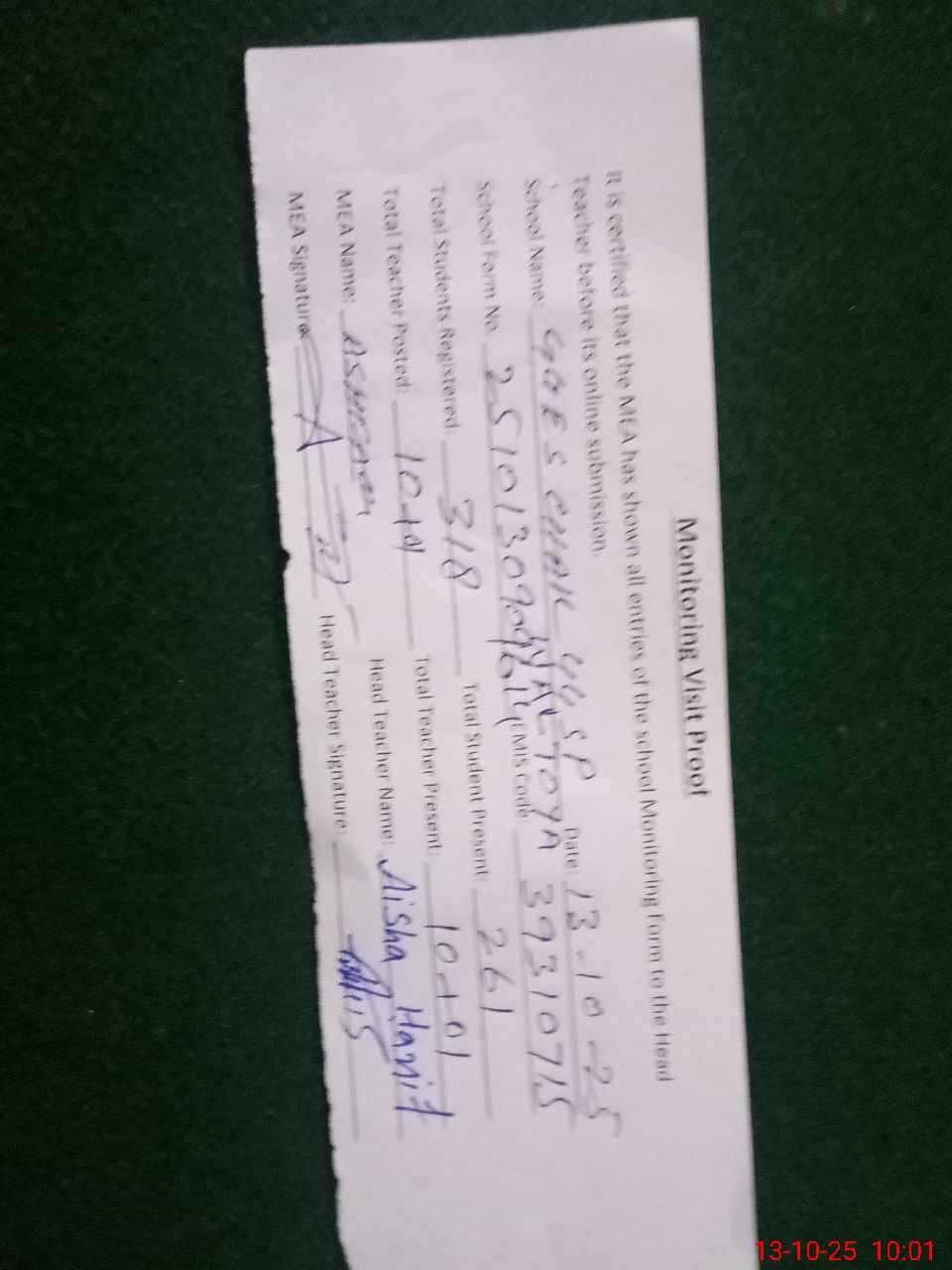 | Attendance Register | Head Teacher | MEA with School | Visit Proof |