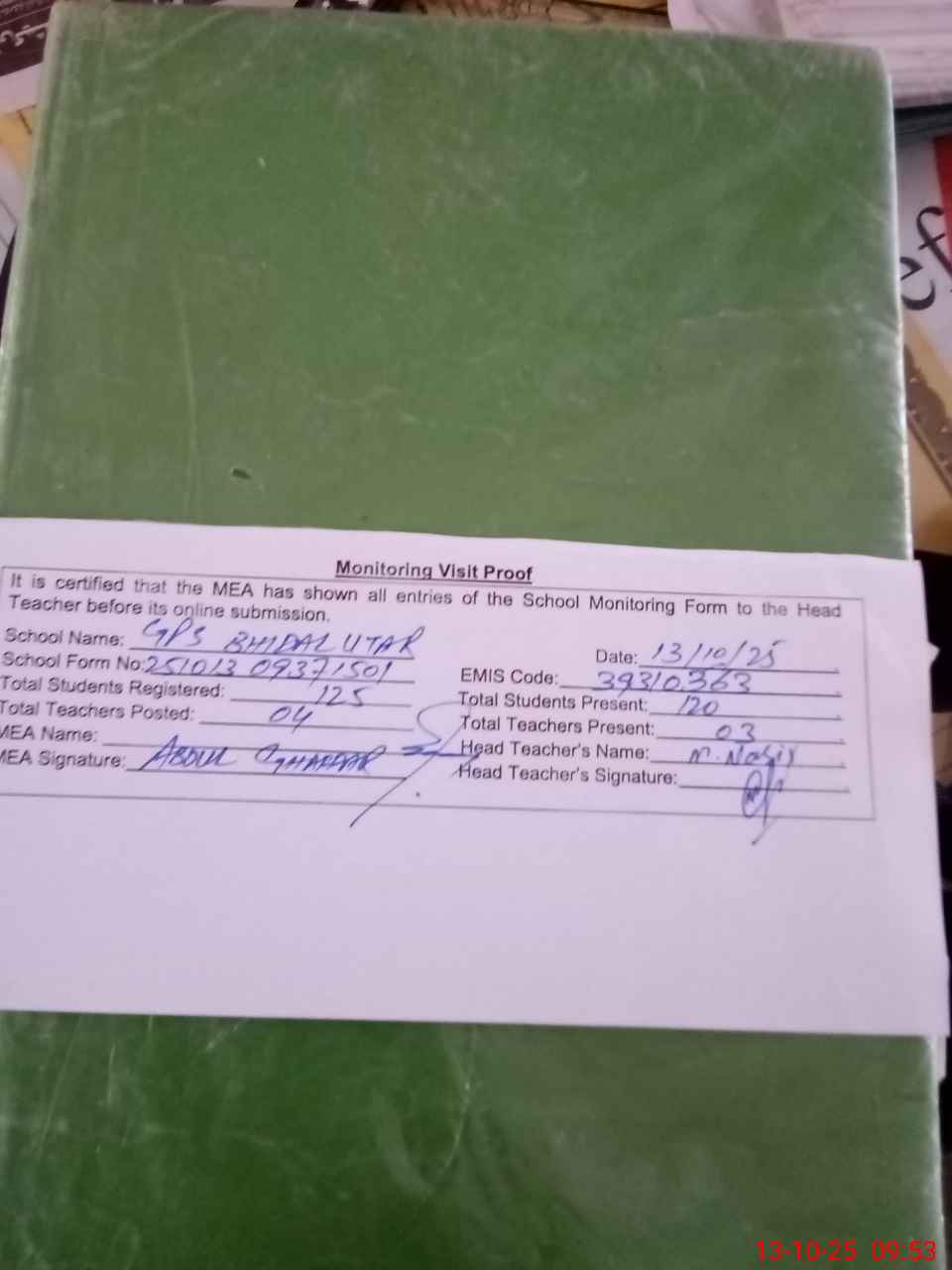| Attendance Register | Head Teacher | MEA with School | Visit Proof |