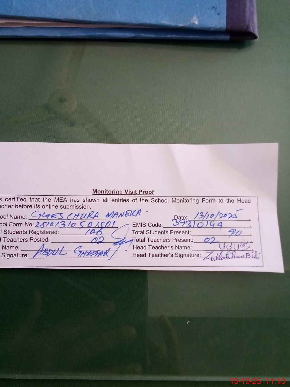 | Attendance Register | Head Teacher | MEA with School | Visit Proof |