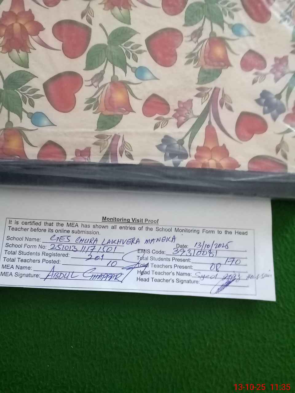 | Certified that this School was Inspected by the Undersigned MEA/DMO Today and the Information Stated Above is as Per Record. | |||||