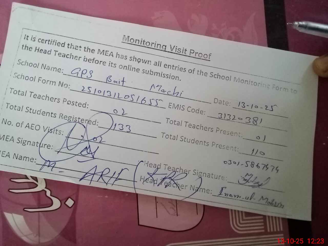 | Attendance Register | Head Teacher | MEA with School | Visit Proof |