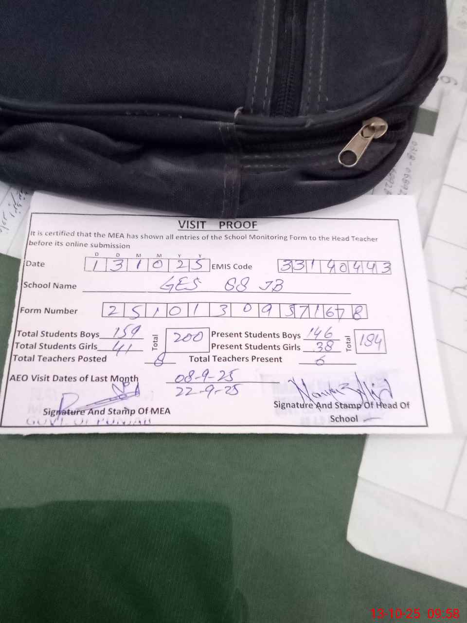 | Attendance Register | Head Teacher | MEA with School | Visit Proof |