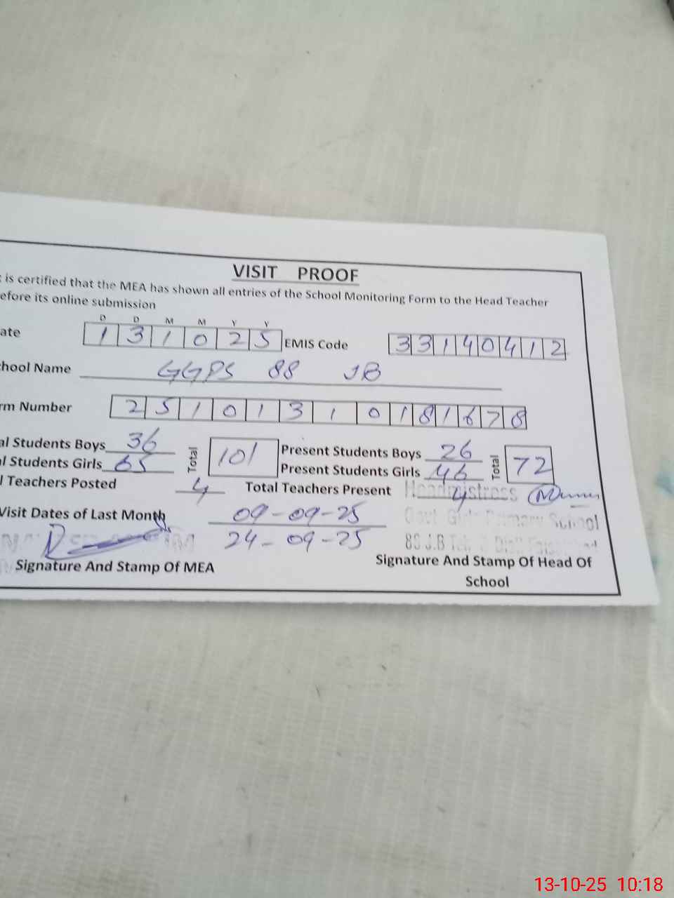 | Attendance Register | Head Teacher | MEA with School | Visit Proof |