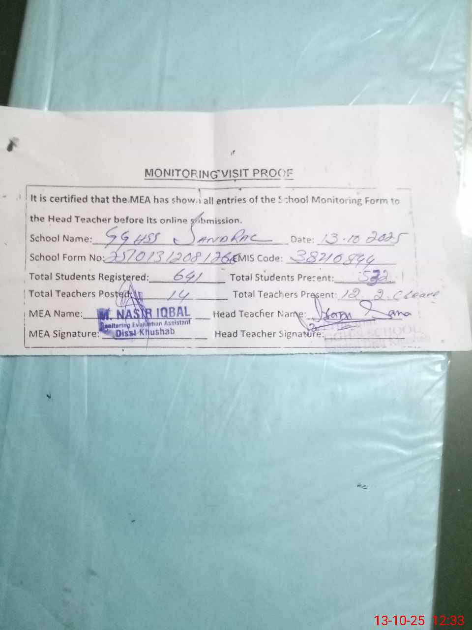 | Certified that this School was Inspected by the Undersigned MEA/DMO Today and the Information Stated Above is as Per Record. | |||||