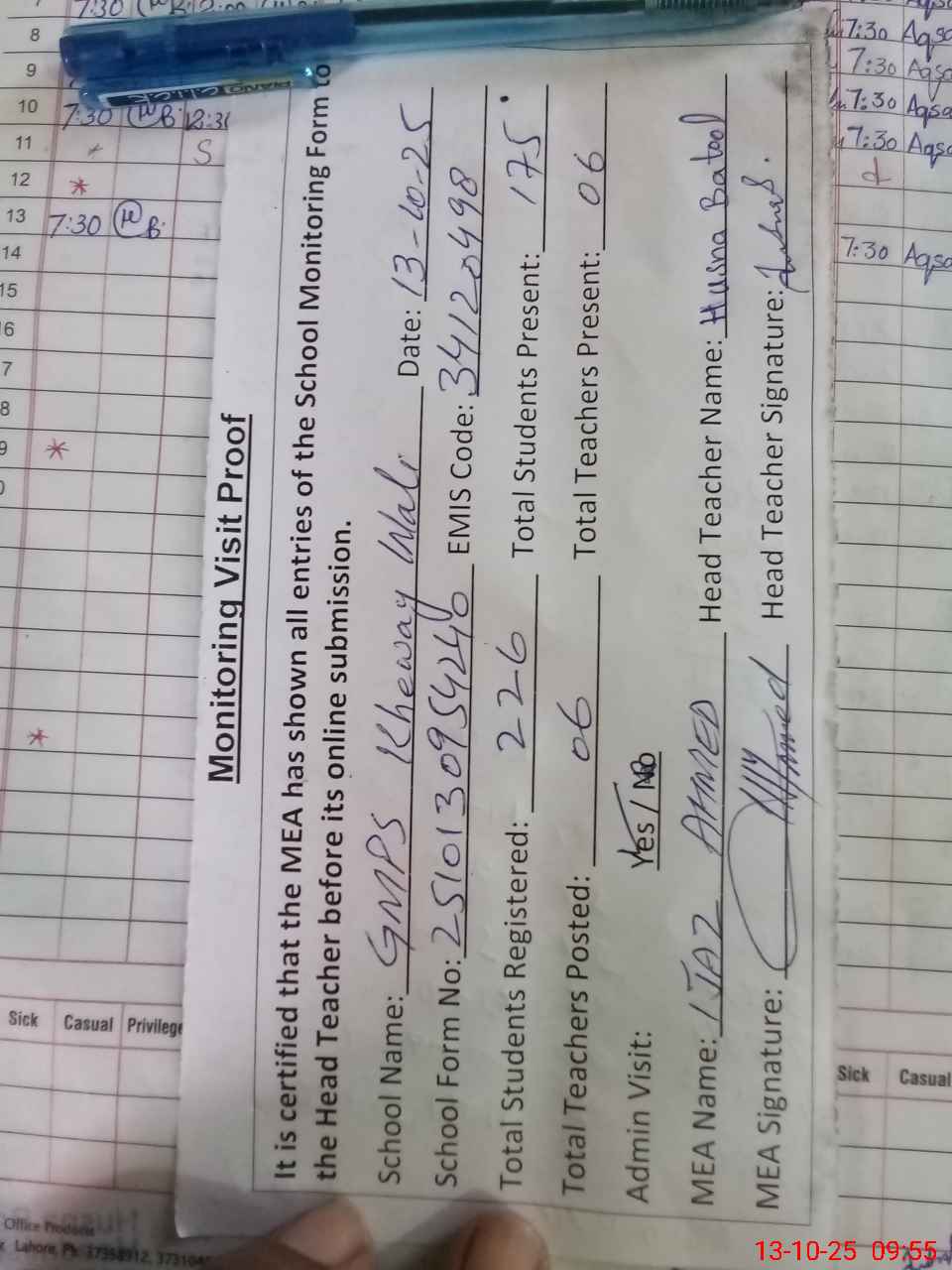 | Attendance Register | Head Teacher | MEA with School | Visit Proof |