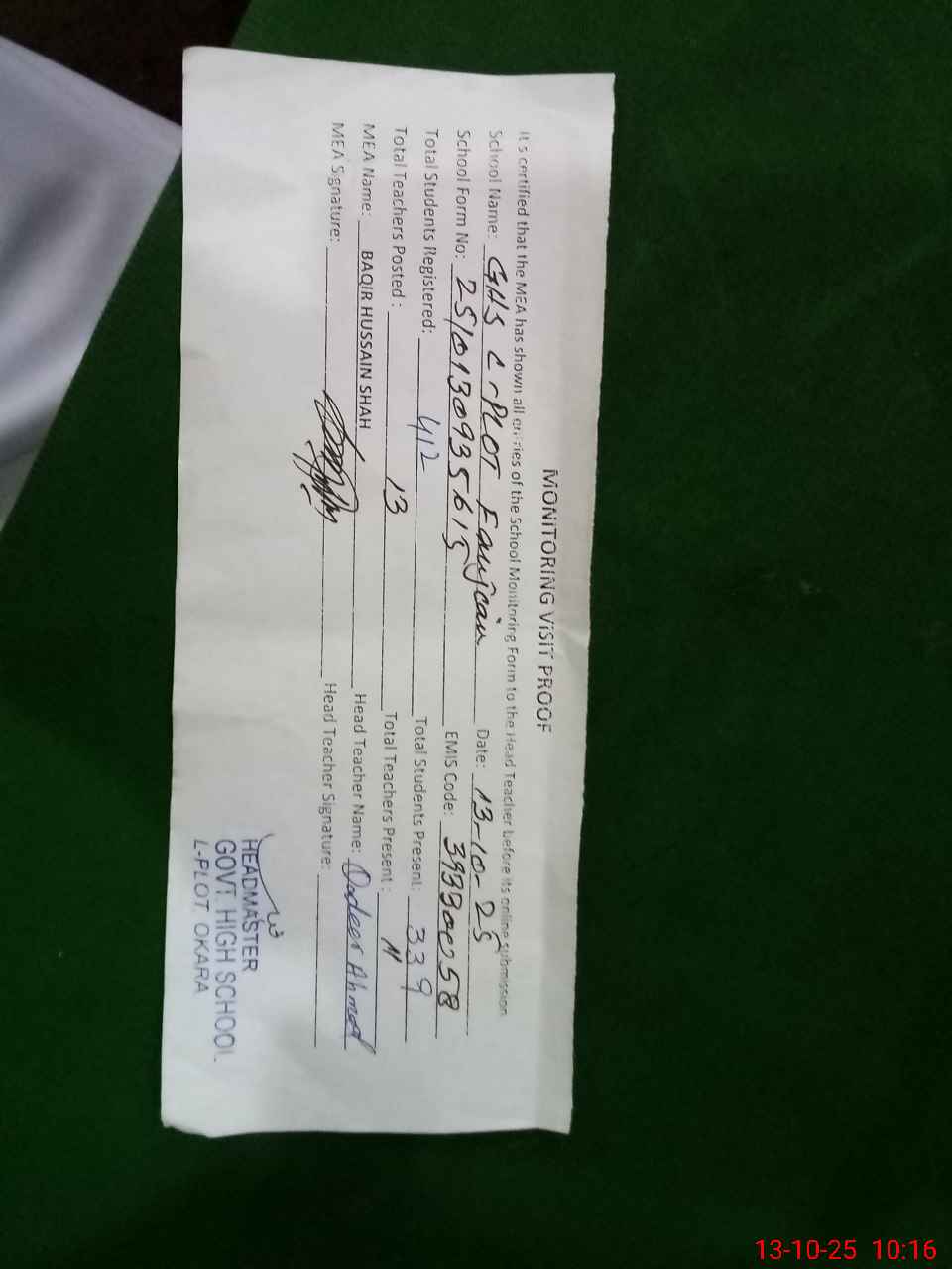 | Certified that this School was Inspected by the Undersigned MEA/DMO Today and the Information Stated Above is as Per Record. | |||||