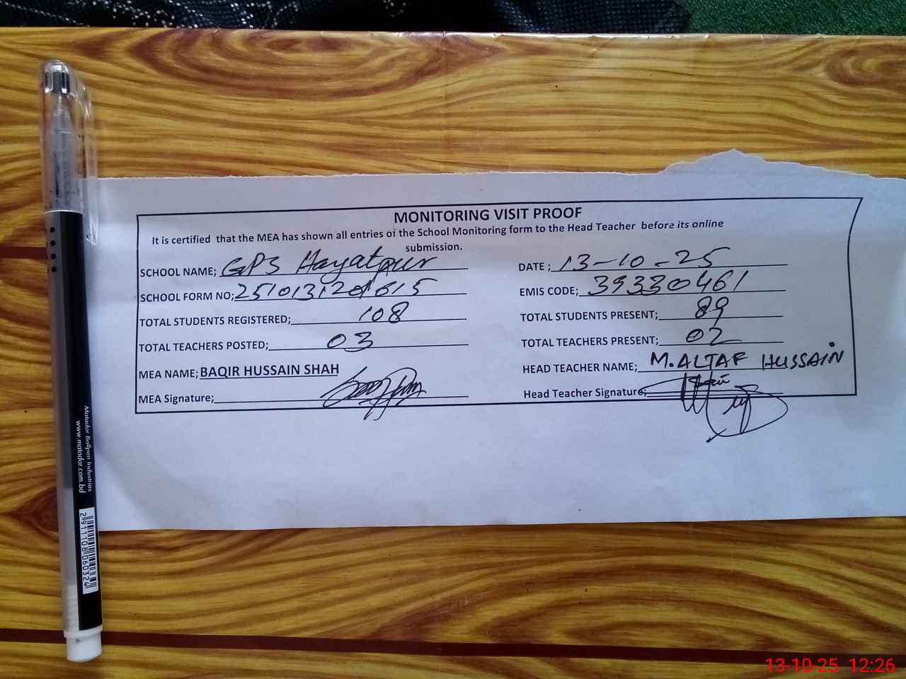 | Attendance Register | Head Teacher | MEA with School | Visit Proof |