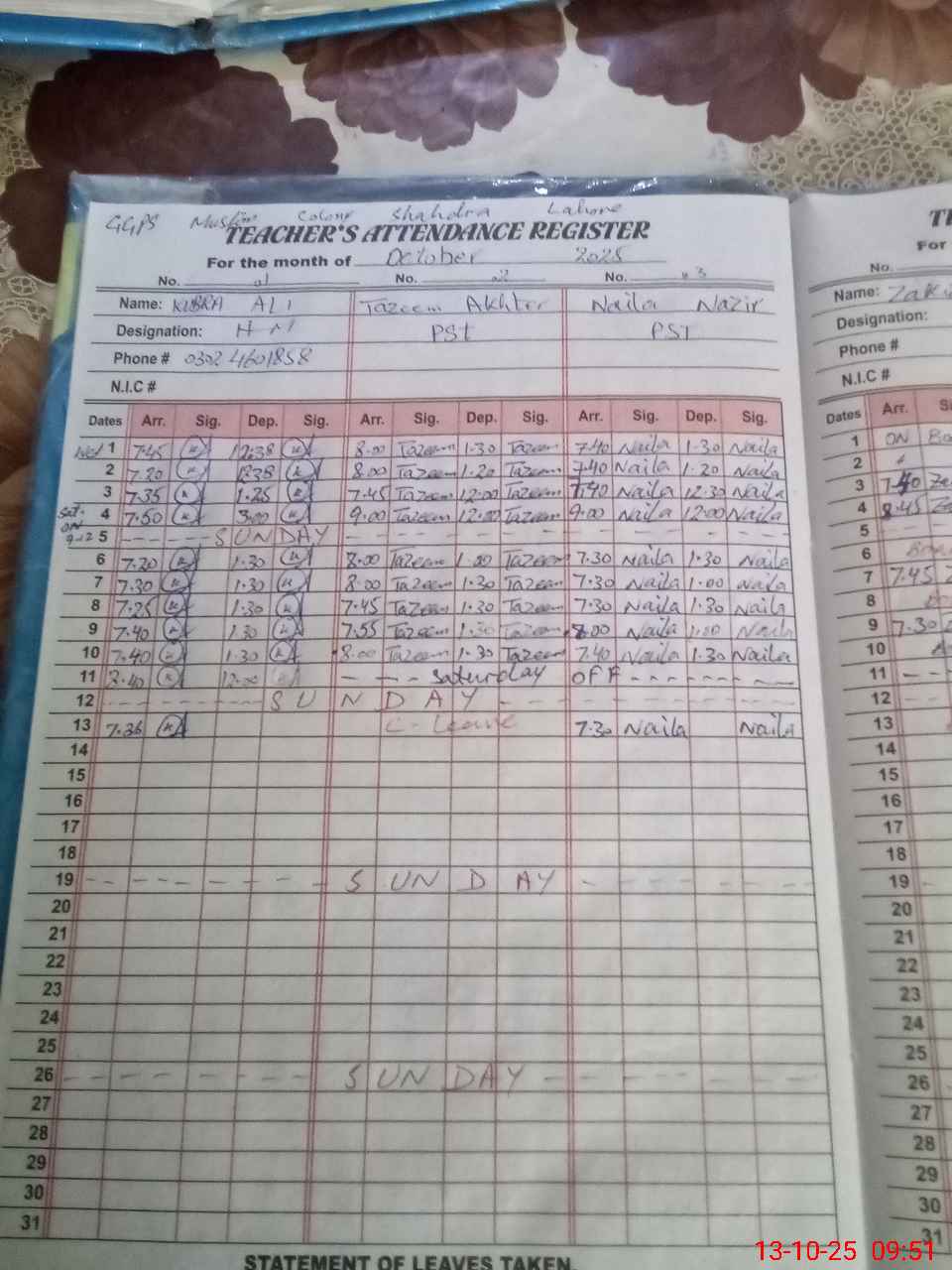 | Remarks (Use Separate Page if Required): Chokidar Qalb e Abbas surrendered from 20 June 2025 till now Moreover in this monitoring application there is no option available to show him surrender so I marked him absent Currently he is on the disposal of Dy Deo office EMIS CODE 35220415 | |||||