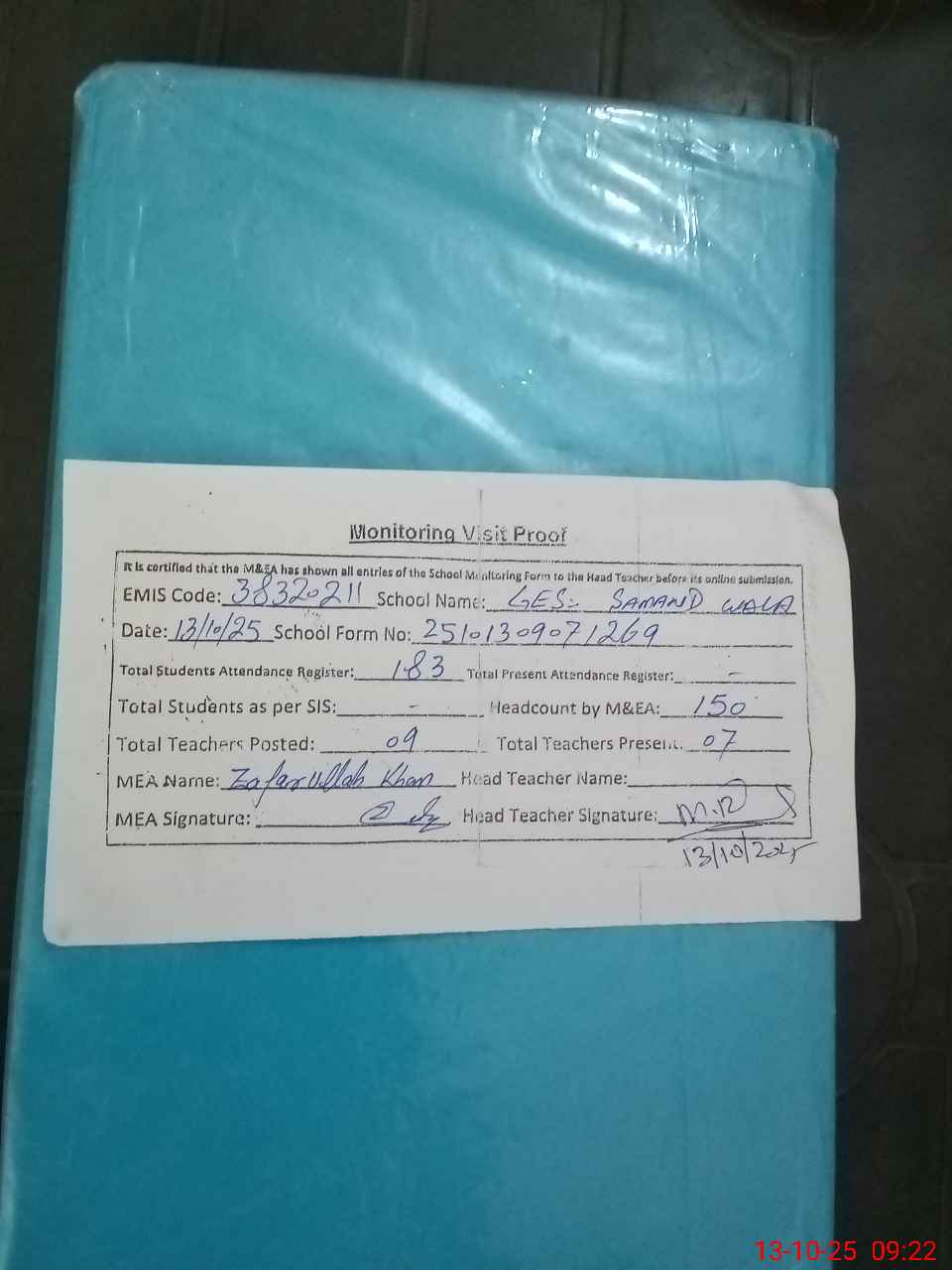 | Attendance Register | Head Teacher | MEA with School | Visit Proof |