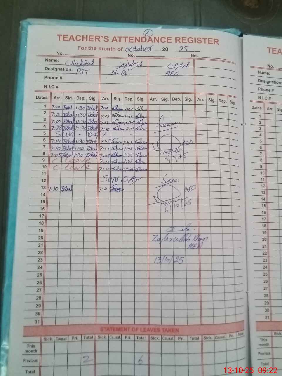 | CNIC | Full Name | Designation | R/C | Absence during last cal. month |