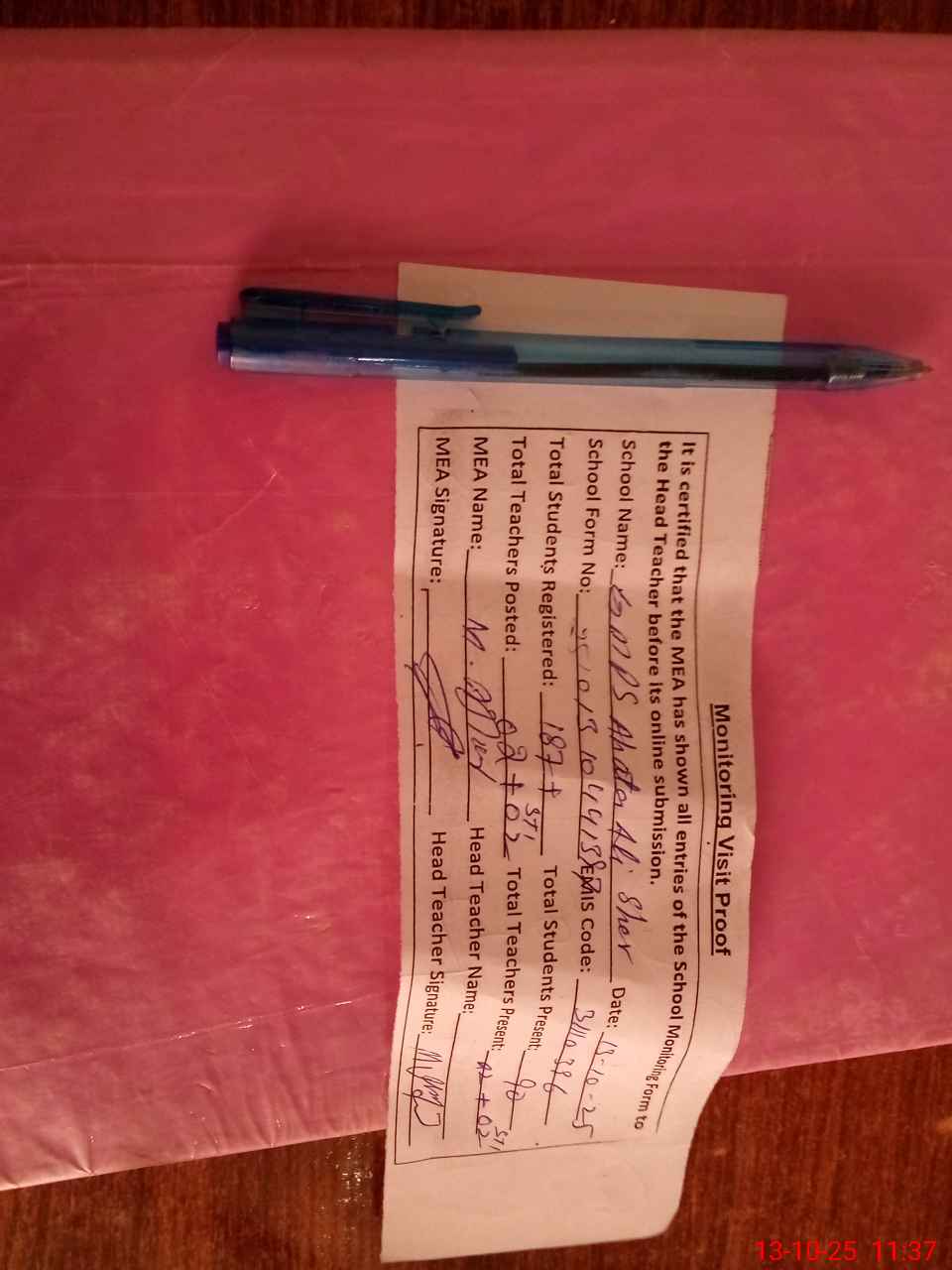 | Attendance Register | Head Teacher | MEA with School | Visit Proof |
