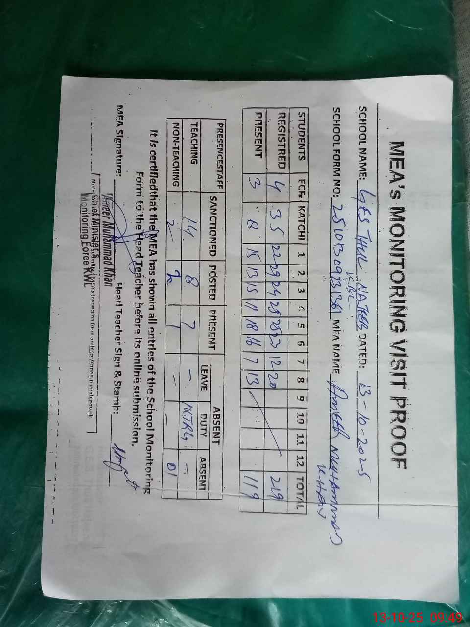| Certified that this School was Inspected by the Undersigned MEA/DMO Today and the Information Stated Above is as Per Record. | |||||
