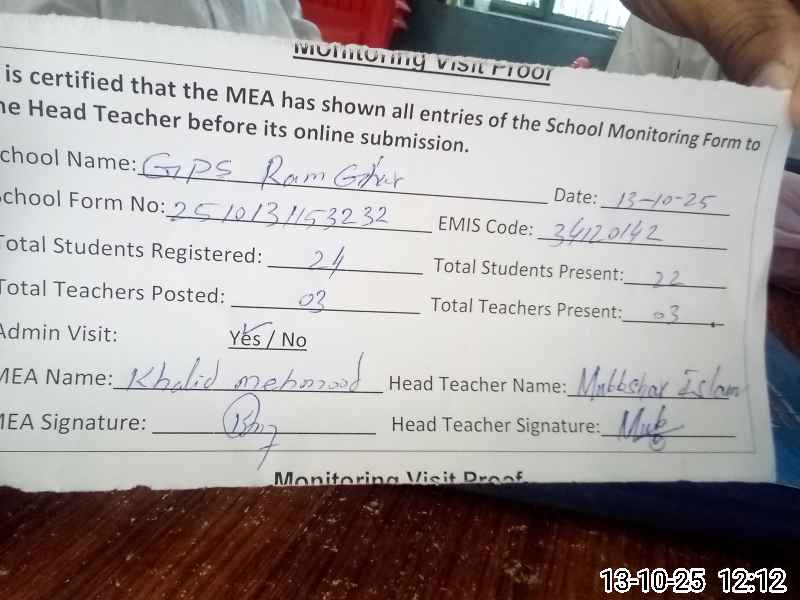 | EMIS Code: 34120142 | Name of School: GPS RAM GHUAR | |||